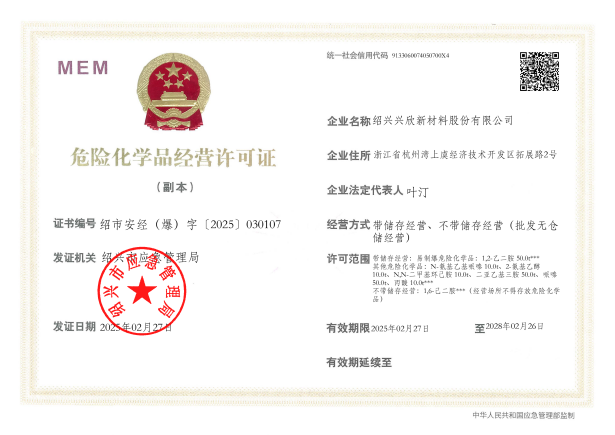 紹興興欣新材料股份有限公司成立于2002年06月27日,占地面積122畝,位于杭州灣上虞經(jīng)濟(jì)技術(shù)開發(fā)區(qū)拓展路2號,現(xiàn)有職工200余人,專業(yè)技術(shù)人員50余人;博士、碩士研究生30余人組成的一支知識型、專業(yè)化的技術(shù)科研團(tuán)隊(duì)。公司面向全球市場,專業(yè)開發(fā)電子化學(xué)品、環(huán)保化學(xué)品、醫(yī)藥中間體、高分子材料等先進(jìn)新材料重點(diǎn)領(lǐng)域的省級科技型企業(yè);建有浙江上虞、安徽東至兩個生產(chǎn)基地。目前為“國家高新技術(shù)企業(yè)”、浙江省“隱形冠軍”企業(yè)、浙江省專精特新中小企業(yè);建有“省級”研究開發(fā)中心,共建天津大學(xué)浙江紹興研究院電子化學(xué)品研發(fā)中心。